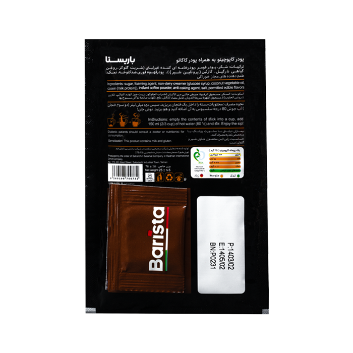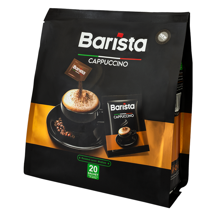 کاپوچینو باریستا، یک پودر ترکیبی از مخلوطهای کاپوچینو است که برای استفاده در خانه، محل کار یا سفر و در هر زمانی مناسب است. این محصول ترکیبی از طعم تلخ قهوه اسپرسو با لطافت شیر و یک خامه حجیم شده با ظاهری دلربا است که در کمترین زمان و بدون دستگاه و تنها با مخلوط شدن با یک فنجان آب جوش آماده نوشیدن است.